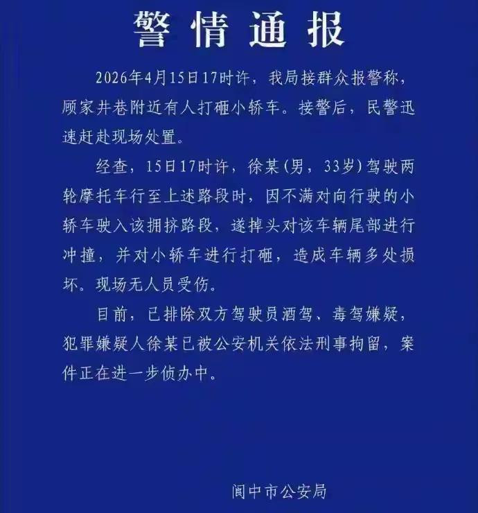 4月16日,阆中市公安局发布正式警情通报,详细披露案件情况:2026年4月15日17时许,徐某(男,33岁)驾驶两轮摩托车行至顾家井巷附近时,因不满对向行驶的小轿车驶入该拥挤路段,遂掉头对该车辆尾部进行冲撞,并对小轿车进行打砸,造成车辆多处损坏。经核查,双方驾驶员均排除酒驾、毒驾嫌疑。目前,徐某因涉嫌故意毁坏财物罪,已被公安机关依法刑事拘留,案件正在进一步侦办中。