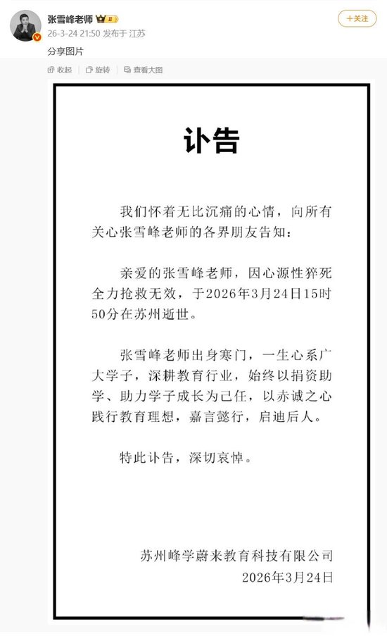 【心源性猝死,张雪峰不幸去世】今晚(3月24日),苏州峰学蔚来教育科技有限公司发布讣告称,张雪峰因突发疾病,经抢救无效不幸去世。